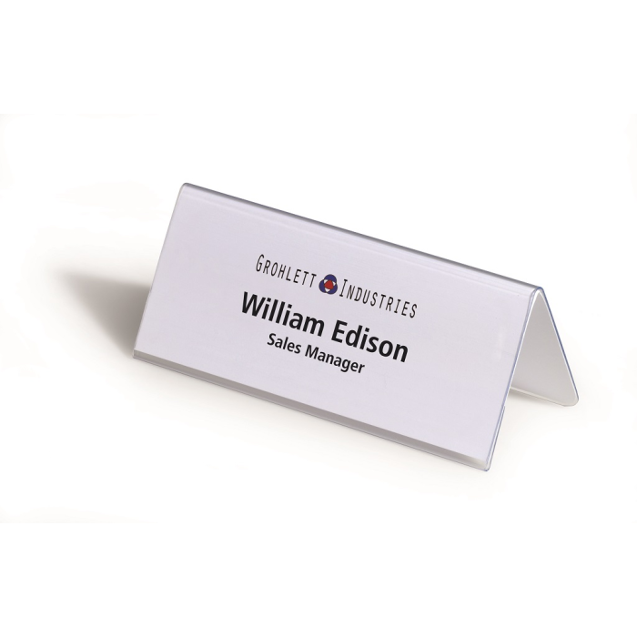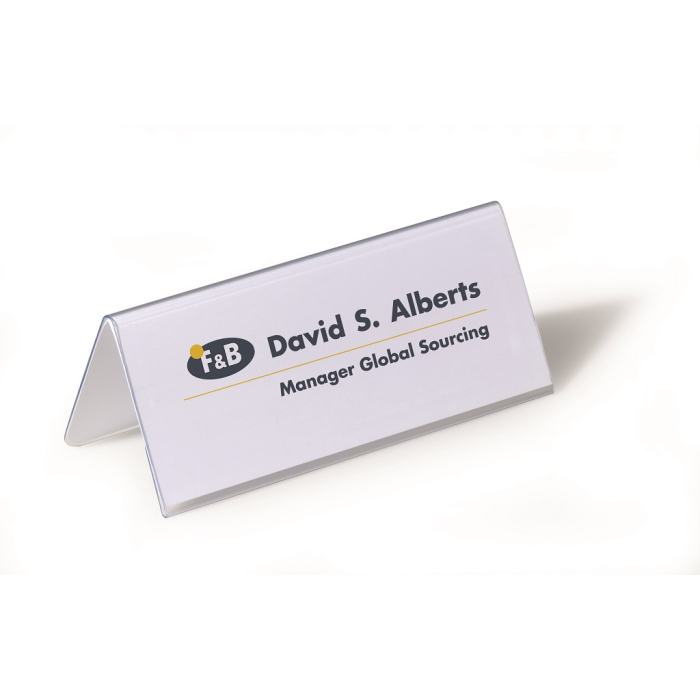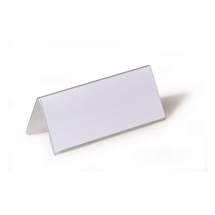 Obojstranne čitateľná stolová menovka z pevného PVC, vhodná na konferencie, recepčné pulty, ceny tovarov a popis produktov. Dodávaná s vymeniteľnou prázdnou kartou. Väčšie balenie 25 ks. Rozmery: >61x150 mm Výrobca: Durable