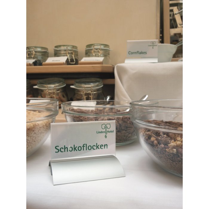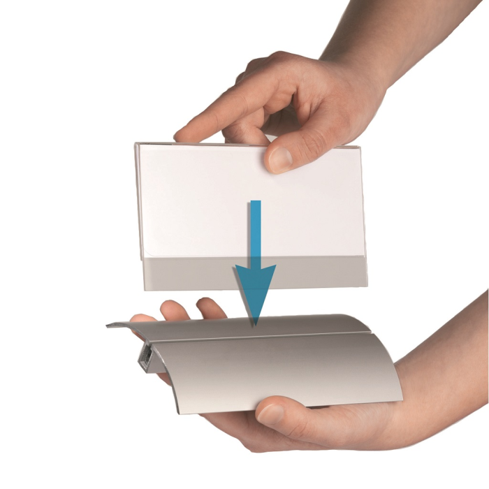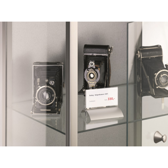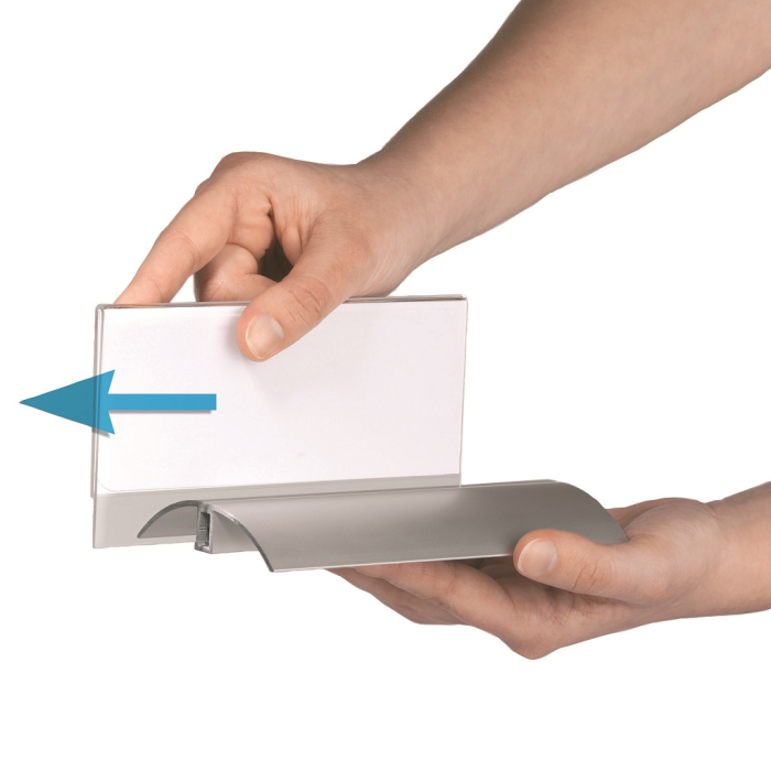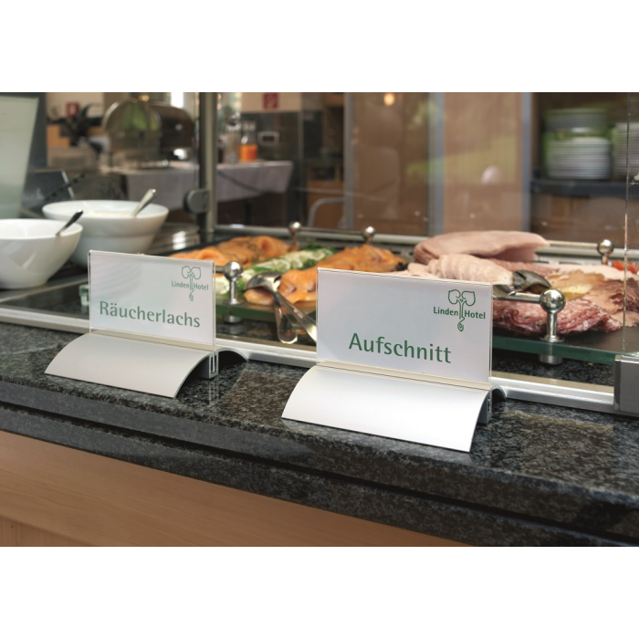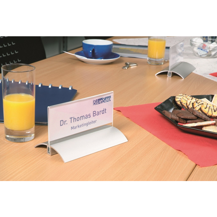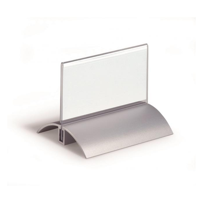 Štýlová stolová menovka s hliníkovým podstavcom. Unikátny uchytávací systém zabraňuje samovoľnému alebo neželanému vysunutiu menovky.Čítanie z oboch strán. Ideálna na konferencie, porady alebo miesta na styk so zákazníkom. Balenie 2 ks.