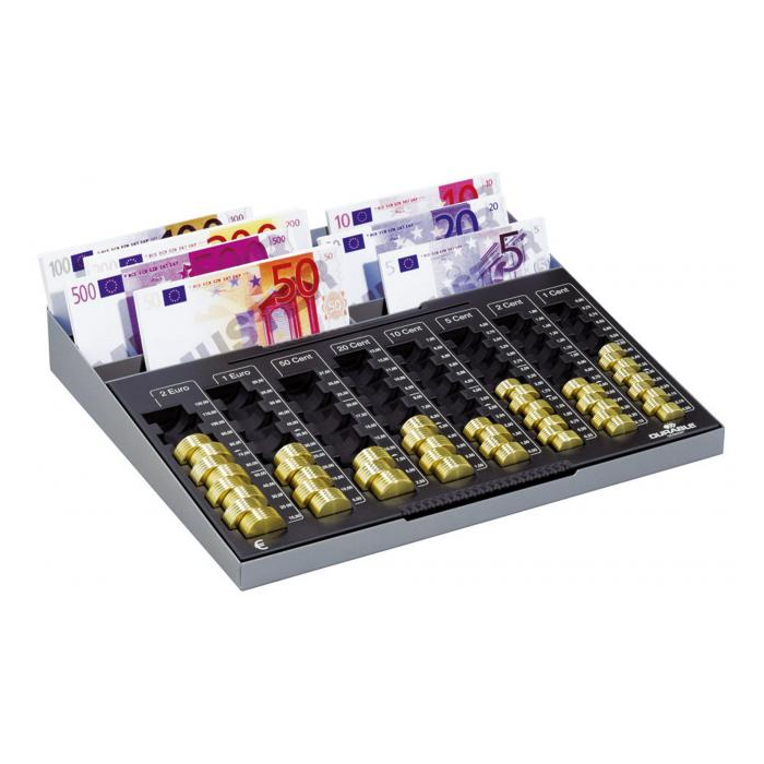 Samostatná mincová priehradka v oceľovom ráme. Rozmerovo vhodná do bežnej stolovej zásuvky. Obsahuje osem oddielov na eurá a centy v maximálnej hodnote 233,90 Euro. Priehradka na bankovky, poukážky alebo stravné lístky vo vrchnej časti. Rozmery: 328 × 59 × 286 mm