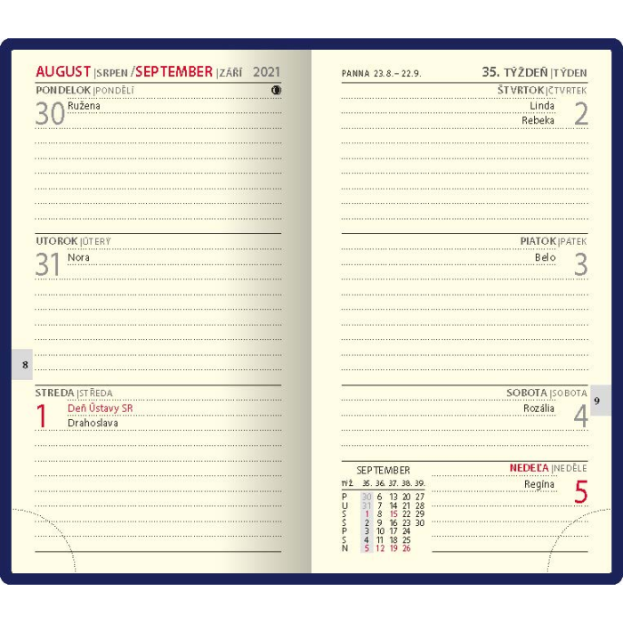 Obľúbený diár s graficky prepracovaným týždenným kalendáriom Vám spríjemní každý týždeň novým mottom spolu s praktickými radami, ktoré sú ovplyvňované fázami Mesiaca. Slovenské texty a kalendárium slovenské , druhý jazyk kalendária je český.