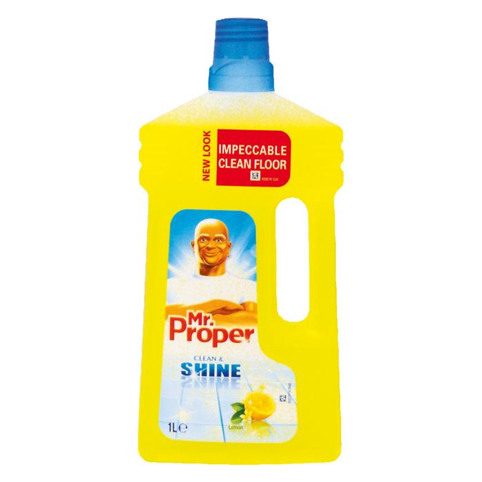 Mr. Proper Lemon na rýchle a jednoduché umývanie podláh a veľkých plôch. Návod na použitie:Riedený prostriedok: 60ml na 5l vody. Nie je potrebné oplachovať a utierať do sucha. Nezriedený prostriedok: Po použití povrch opláchnite. Pozor. Spôsobuje vážne podráždenie očí. Uchovávajte mimo dosahu detí. Ak je potrebná lekárska pomoc, majte k dispozícii obal alebo etiketu výrobku. PO ZASIAHNUTÍ OČÍ: Niekoľko minút ich opatrne vyplachujte vodou. Ak používate kontaktné šošovky a je to možné, odstráňte ich. Pokračujte vo vyplachovaní. Obsahuje Benzisothiazolinone. Môže vyvolať alergickú reakciu. Zloženie: <5% aniónové povrchovo aktívne látky, neiónové povrchovo aktívne látky, fosfonáty