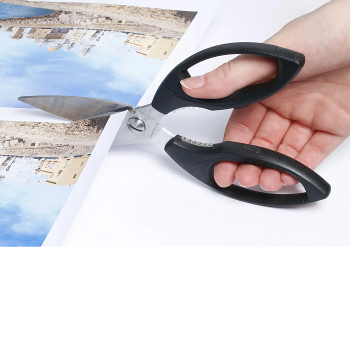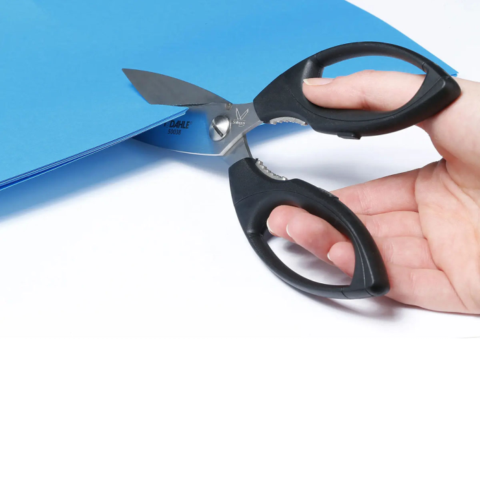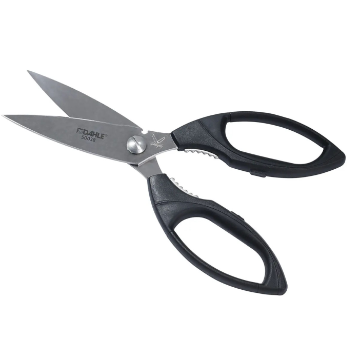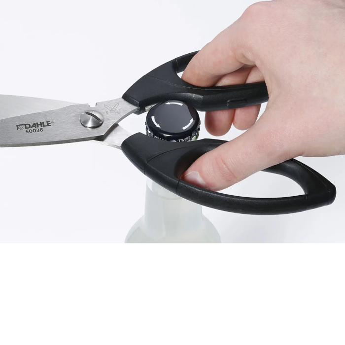 Vysokokvalitné profesionálne nožnice s precízne brúsenými čepeľami s mikro zúbkovaním a špeciálne brúseným ostrím, rukoväťou z ABS plastu a strihacou časťou z vysoko kvalitnej nehrdzavejúcej ocele. Určené na rezanie tvrdých a pevných materiálov. Nehrdzavejúce, umývateľné v umývačke riadu a farebne stály materiál pre dlhú životnosť. Každé nožnice sú ručne testované pre zaručenie maximálnej kvality. Praktická pridaná hodnota vďaka otváraču na poháre integrovanému v rukovätiach. Farba čierna. Veľkosť: 21 cm