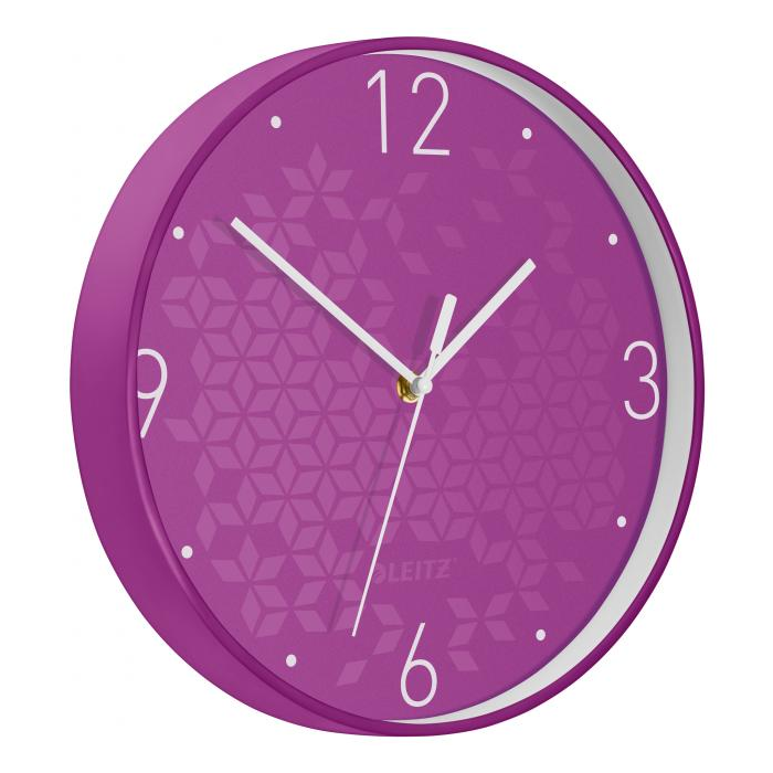 Quartz hodiny z produktového radu Leitz WOW. Tichý chod, dvojfarebný rám z pevného plastu v kombinácii so sklenenou prednou stranou. Jasný ciferník vo WOW farbách s veľkými číslicami, tri kontrastné ručičky viditeľné aj z diaľky. Priemer 29 cm, hrúbka 4,3 cm. Batéria AA nie je súčasťou balenia. Farba purpurová.