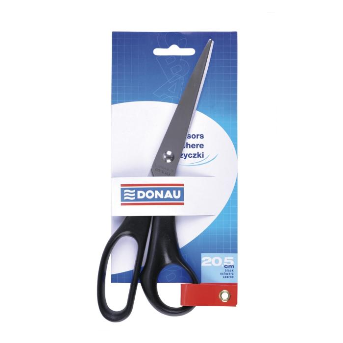 Kancelárske nožnice na strihanie papiera, kartónu, lepenky, samolepiacej pásky a pod. s pogumovaným úchytom a strihacou časťou z nehrdzavejúcej ocele. Farba čierna. Väčšie balenie 12 ks.