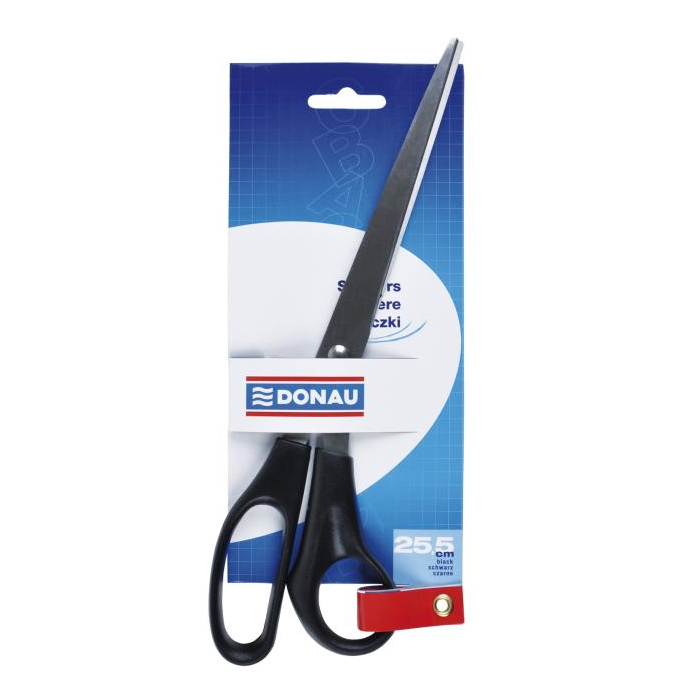 Univerzálne kancelárske nožnice na strihanie papiera, kartónu, lepenky, samolepiacej pásky a pod. so strihacou časťou z nehrdzavejúcej ocele. Farba čierna. Väčšie balenie 12 ks. Veľkosť: 25,5 cm