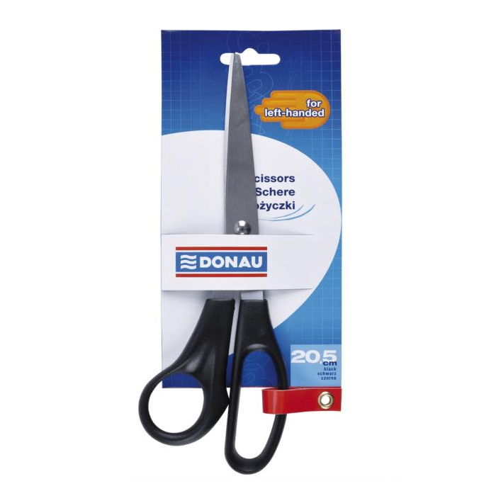 Kancelárske nožnice pre ľavákov na strihanie papiera, kartónu, lepenky, samolepiacej pásky a pod. s pogumovaným úchytom a strihacou časťou z nehrdzavejúcej ocele. Farba čierna. Veľkosť: 20,5 cm