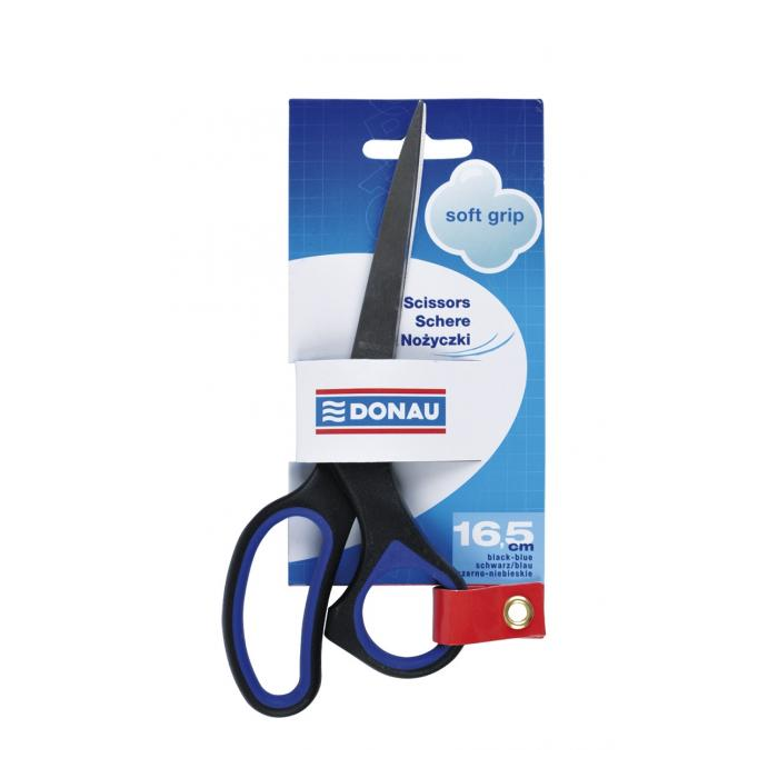 Kancelárske nožnice na strihanie papiera, kartónu, lepenky, samolepiacej pásky a pod. s pogumovaným úchytom a strihacou časťou z nehrdzavejúcej ocele. Farba čierna/-modrá.