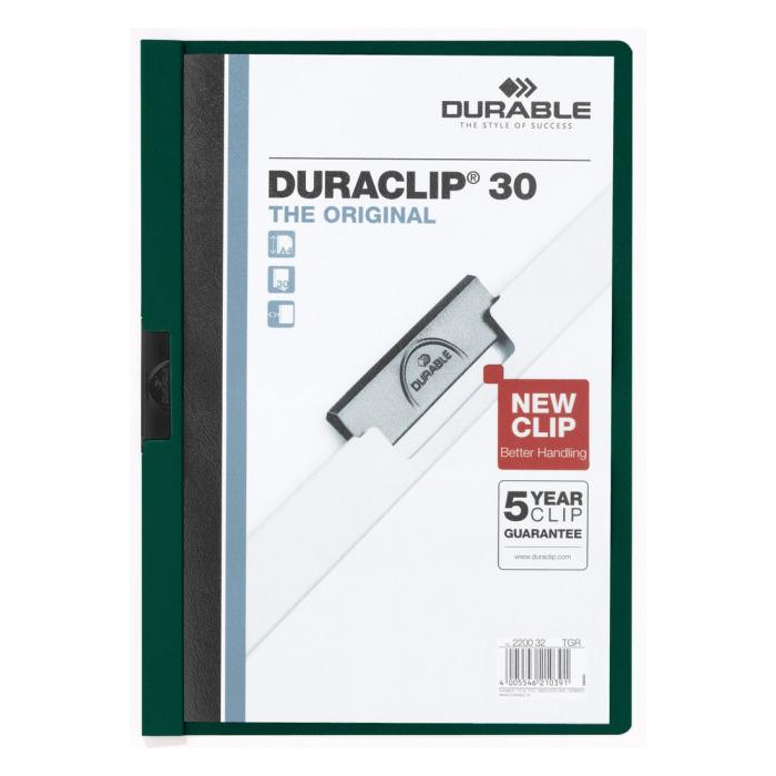Obal vyvinutý spoločnosťou DURABLE pre viazanie nedierovaných listov. Materiál z PVC s unikátnym kovovým klipom, ktorý sa prispôsobí vloženému počtu listov a priehľadnou prednou stranou. Ideálny na prezentácie, ponuky, správy, poznámky na konferencie, semináre a pod. Formát A4. Kapacita 1-30 listov. Väčšie balenie 25 ks.