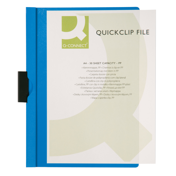 Obal z pevného polypropylénu s priehľadnou prednou stranou a kovovým vyklápacím klipom v čiernej farbe. Formát A4. Kapacita 1 - 30 listov. Väčšie balenie 25 ks. Farba modrá.