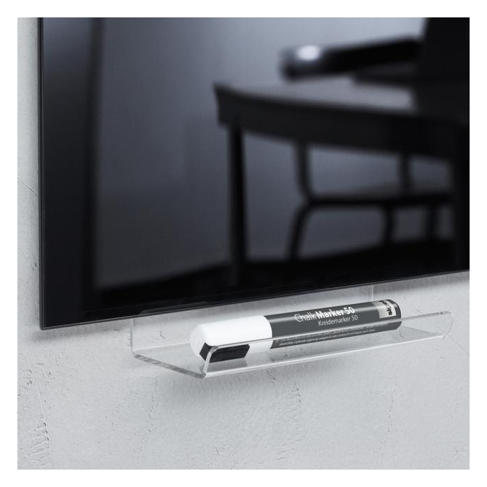 Odkladacia lišta z priehľadného akrylu na popisovače s lepiacim prúžkom pre ľahkú aplikáciu. Dĺžka 17 cm.