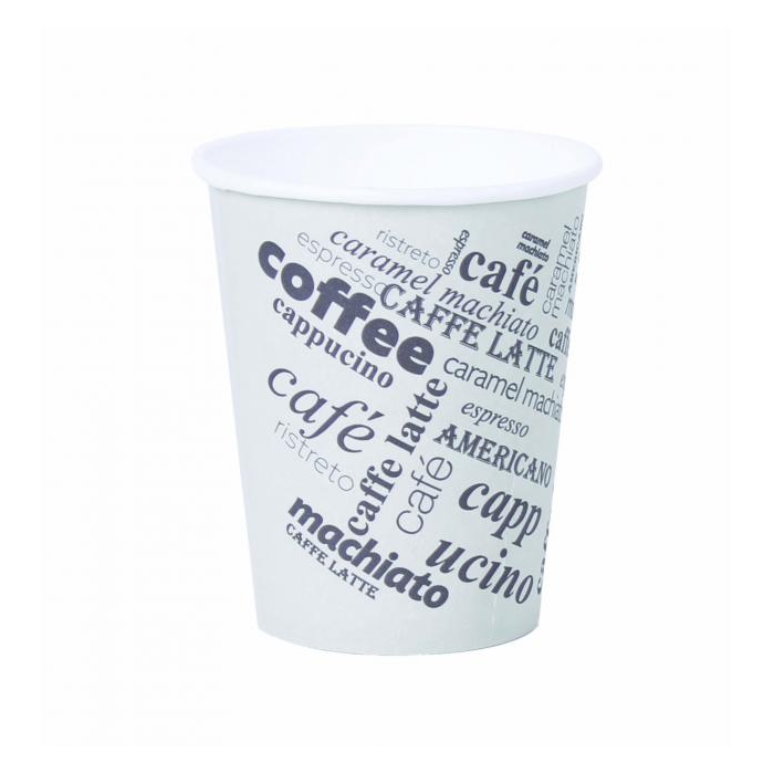 Jednorazové papierové poháre na kávu s motívom. Objem 0,28 l, veľkosť M, vhodný pre nápoje s objemom 0,2l. Priemer 80 mm, dodávané v balení po 50 ks.