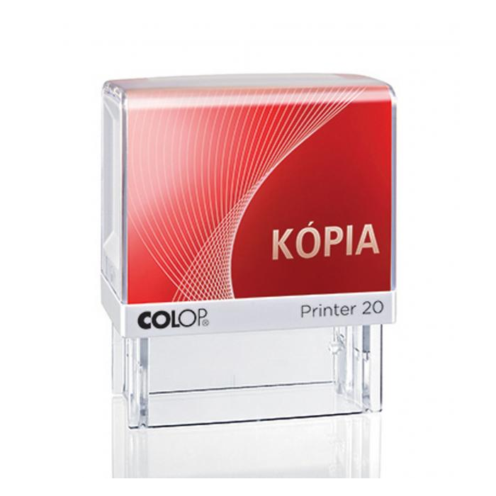 Samofarbiaca pečiatka s hotovým textom: KÓPIA. Veľkosť odtlačku 14 × 38 mm. Farba odtlačku červená. Náhradná poduška E/20 červená. Počet riadkov textu: 1.
