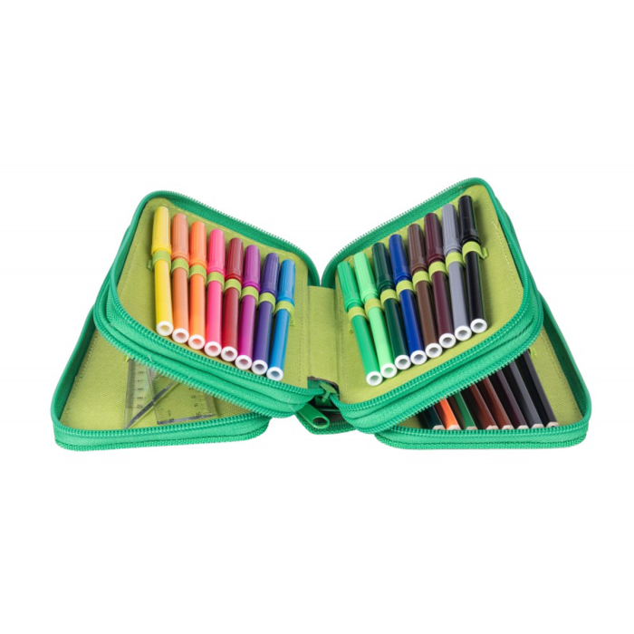 Sada obsahuje príslušenstvo (pravítko, uholník, 3 perá, ceruzku, gumu, strúhadlo, 16 fixiek, 16 pasteliek)