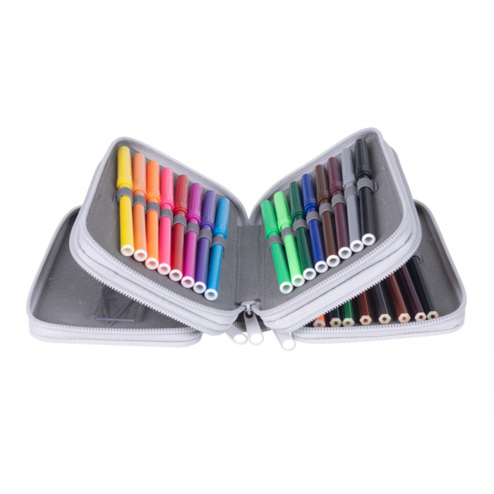 Sada obsahuje príslušenstvo (pravítko, uholník, 3 perá, ceruzku, gumu, strúhadlo, 16 fixiek, 16 pasteliek)
