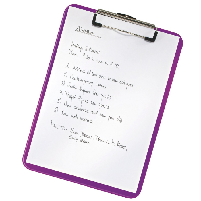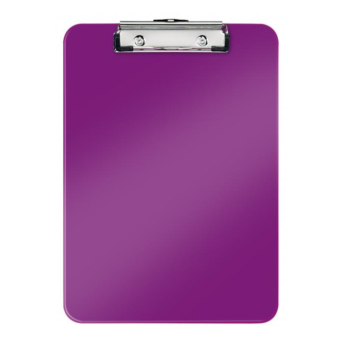 Pevná písacia podložka A4 na každodenné použitie v sviežich farbách WOW s dvojfarebným efektom. Silná kovová spona na uchytenie až 80 listov, háčik na zavesenie. Materiál polystyrol. Väčšie balenie 10 ks. Farba purpurová.