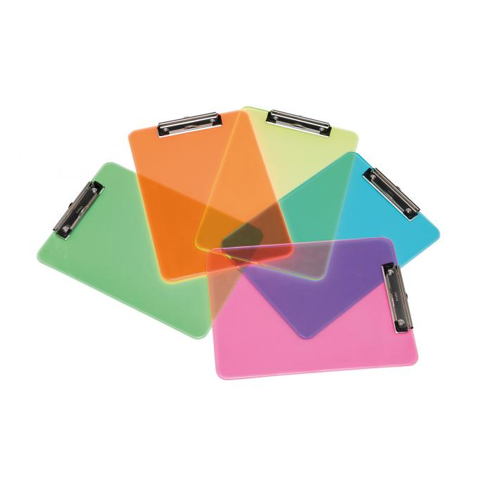 Písacia podložka A4 z priehľadného plastu v piatich neónových farbách s možnosťou zavesenia. Ľahko uchopiteľný silný plochý kovový klip s ochrannými plastovými rohmi. Rozmery 22,6 × 31,8 × 1,5 cm, hrúbka podložky cca 0,24 cm, kapacita klipu cca 0,8 cm, hmotnosť 0,198 kg. Podložka je recyklovateľná. Farba transparentná žltá.
