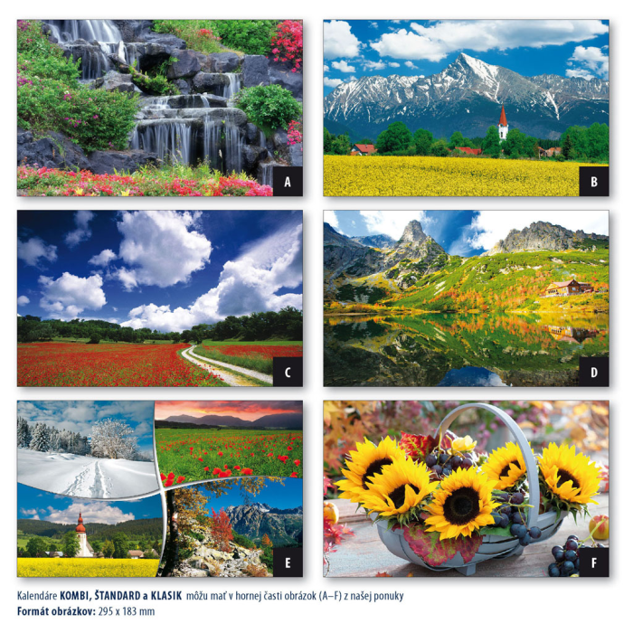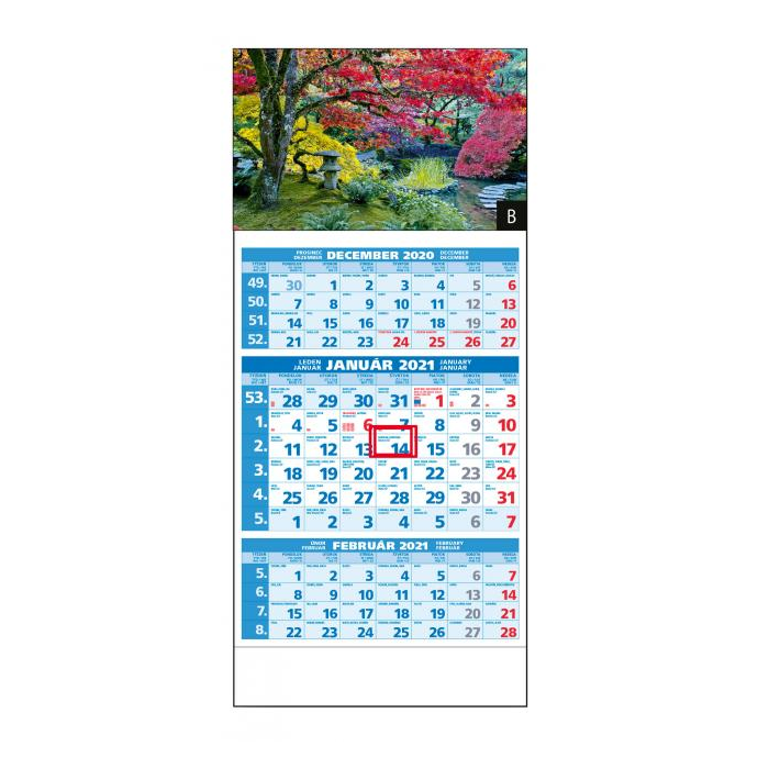Rozmery: 295 x 663 mm. ROZSAH: 12 listov. KALENDÁRIUM: 3-mesačné s menami SK+CZ názvy mesiacov a dní v SK, CZ, UK, DE, HU. VÄZBA: šitá s perforáciou. REKLAMNÁ POTLAČ: 295 x 60 mm. BALENIE: 50 ks.