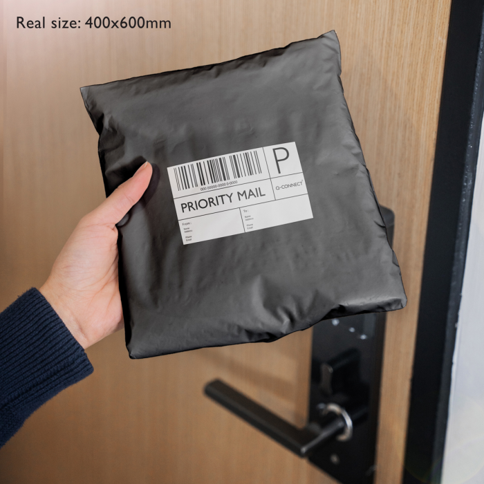 Q-Connect čierne plastové obálky vyrobené zo 100 % recyklovaného materiálu. Trojvrstvová odolná PE fólia 50 mic. Kuriérske tašky sú odolné, vodeodolné, odolné voči roztrhnutiu a prepichnutiu. Majú pevný jednopáskový samotesný uzáver. Rozmery tašky: 400 x 600 mm. Balenie 100 kusov.