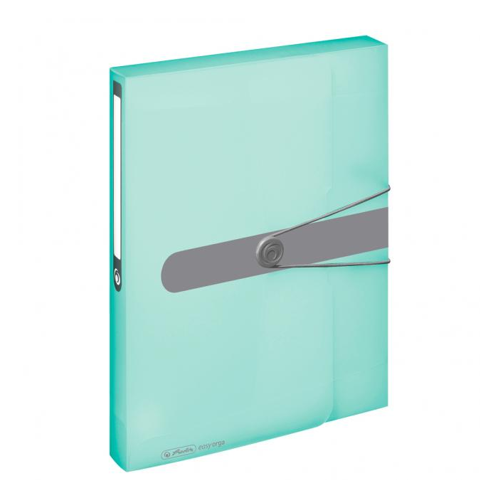 Box z polypropylénu Pastell na dokumenty formátu A4. Kapacita 400 listov, šírka chrbta 4 cm. Zatváranie sivou gumičkou o sivý plastový krúžok, nalepený chrbtový štítok na popis obsahu. Väčšie balenie 10 ks. Farba priehľadná mätová.
