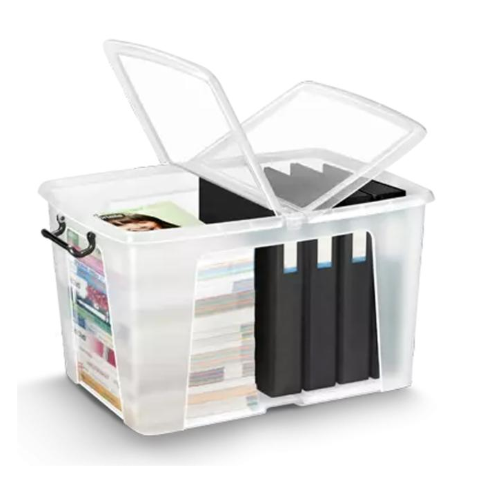 Transparentný robustný multifunkčný box z plastu s vekom, stohovateľný pri nepoužívaní. Motýlie veko na otváranie z 2 strán z dôvodu ľahšieho prístupu, 2 pevné rukoväte slúžiace na prenos boxu a súčasne ako klip na pevné uzatvorenie boxu. Materiál recyklovaný PP. Objem 65 litrov, romery 59 × 45 × 35 cm (dĺžka, šírka, výška). Na tento produkt platí predĺžená záruka 5 rokov.