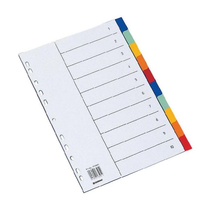 10-dielny A4 plastový farebný rozraďovač bez označenia s eurodierovaním a titulným listom na popisovanie obsahu. Balenie jedna sada v polyesterovom sáčku. Väčšie balenie 25 sád.