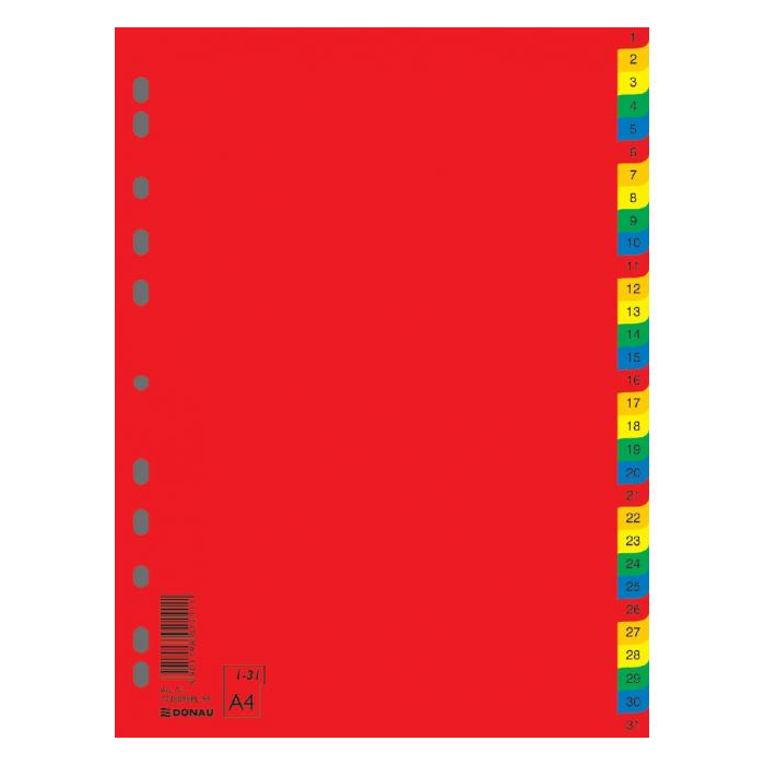 Rozraďovač formátu A4 vyrobený z tuhého polypropylénu. Jednotlivé stránky v rôznych farbách, multiperforácia na použitie rozraďovača v krúžkovom aj pákovom zakladači. Väčšie balenie 10 sád.