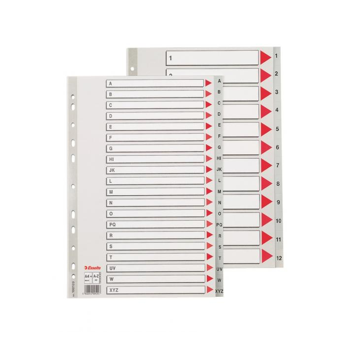 Abecedný rozraďovač z polypropylénu. Eurodierovanie, popisovateľný kartónový titulný list na ľahkú orientáciu v dokumentoch. Formát A4 maxi rozmerov 245×297 mm umožňuje rozlíšenie dokumentov založených v zakladacích obaloch. Balenie jedna sada v po­lyesterovom sáčku. Väčšie balenie 10 sád. Farba sivá.