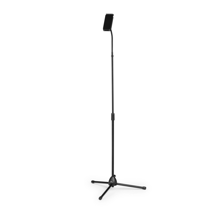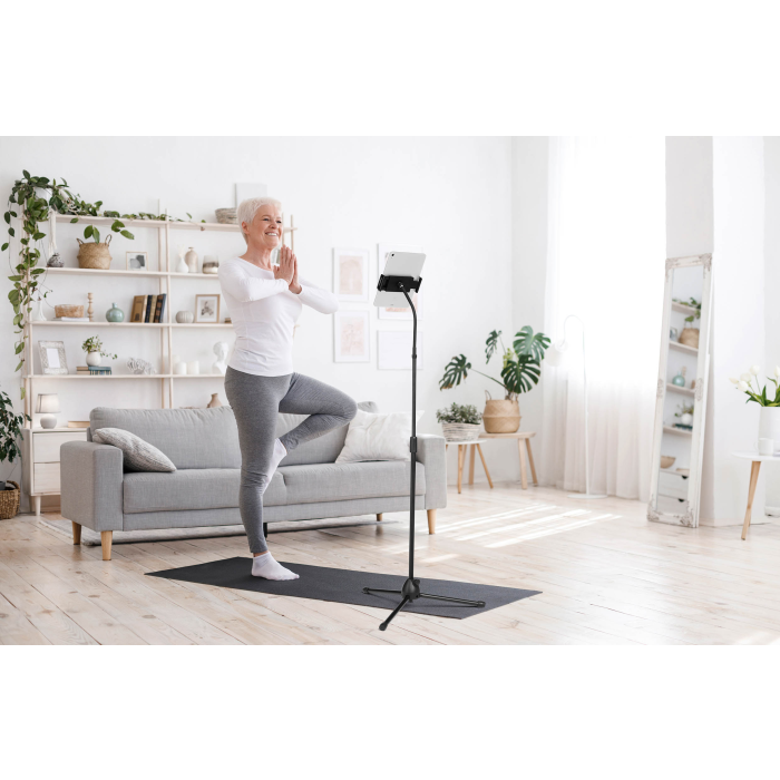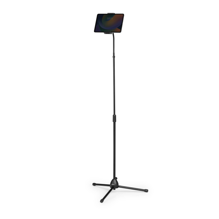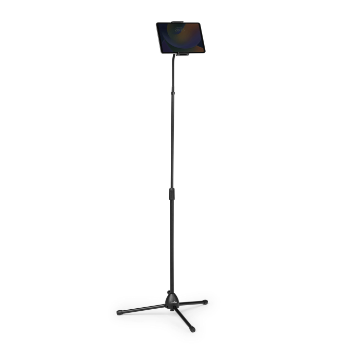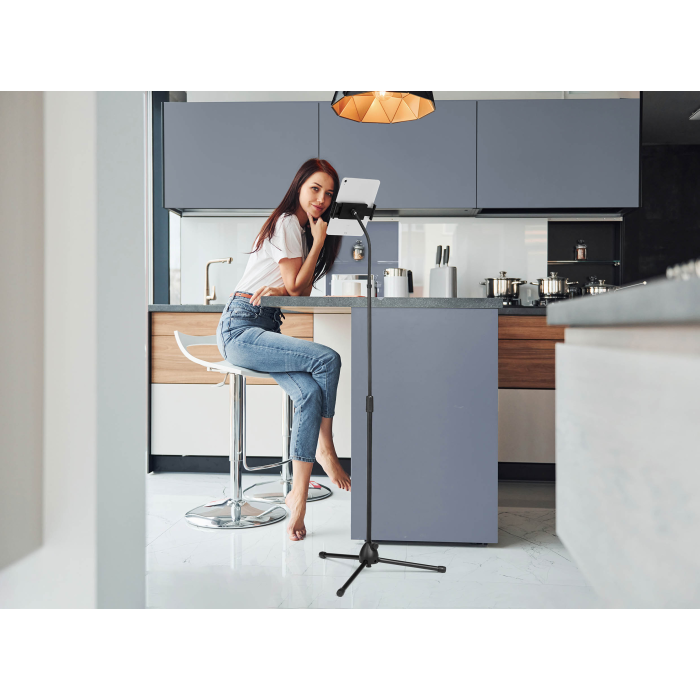 Podlahový stojan s držiakom na tablet a mobilný telefón, vybavený flexibilným ramenom a guľovým kĺbom