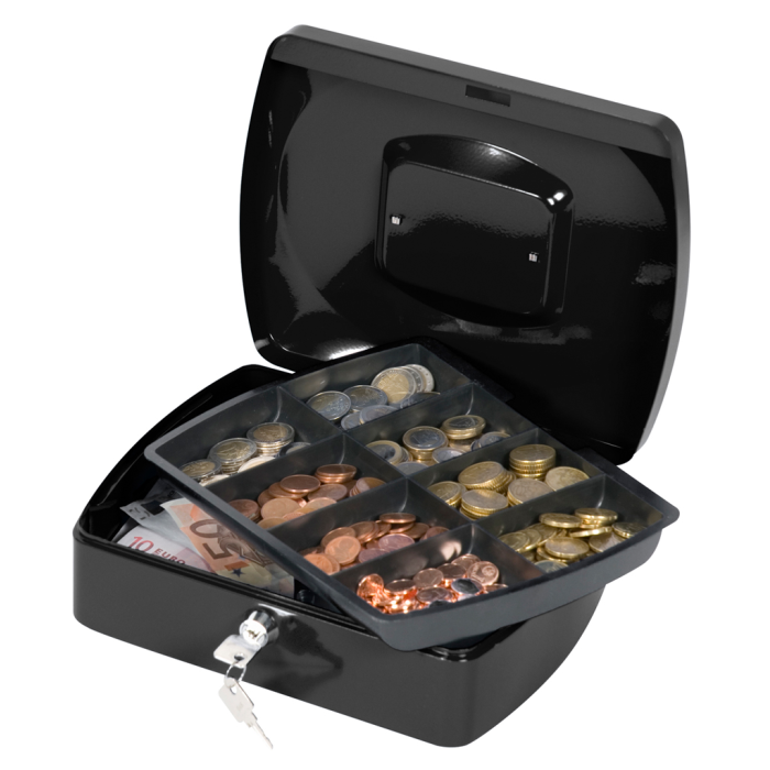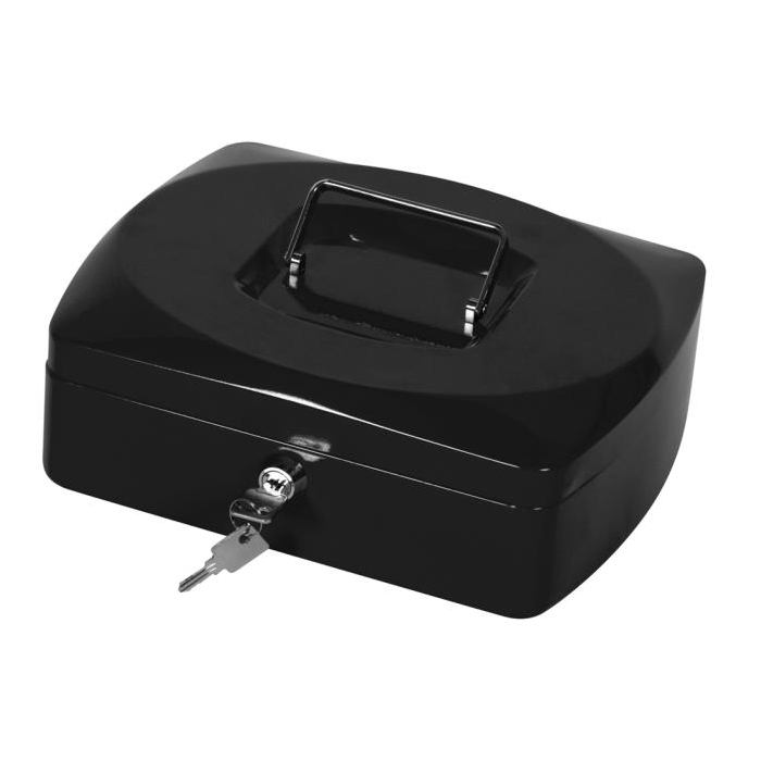 Uzamykateľná pokladnička s tvarovaným úchytom, plastovou priehradkou na mince a 2 kľúčami. Materiál pevná oceľ. Rozmery
