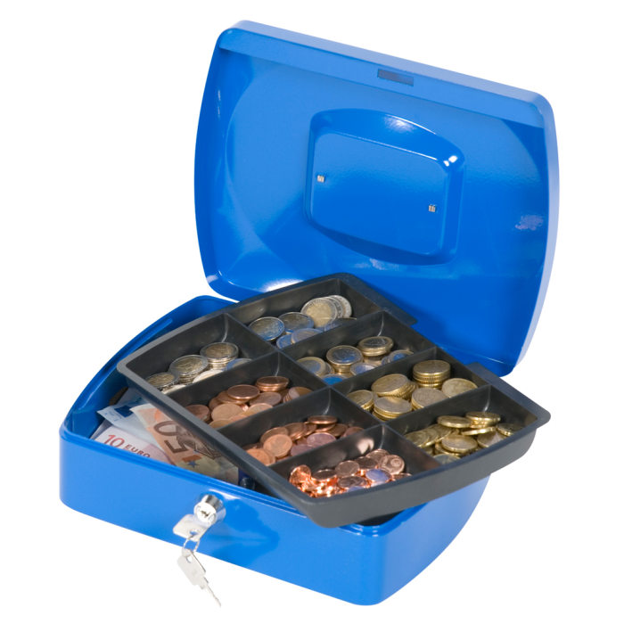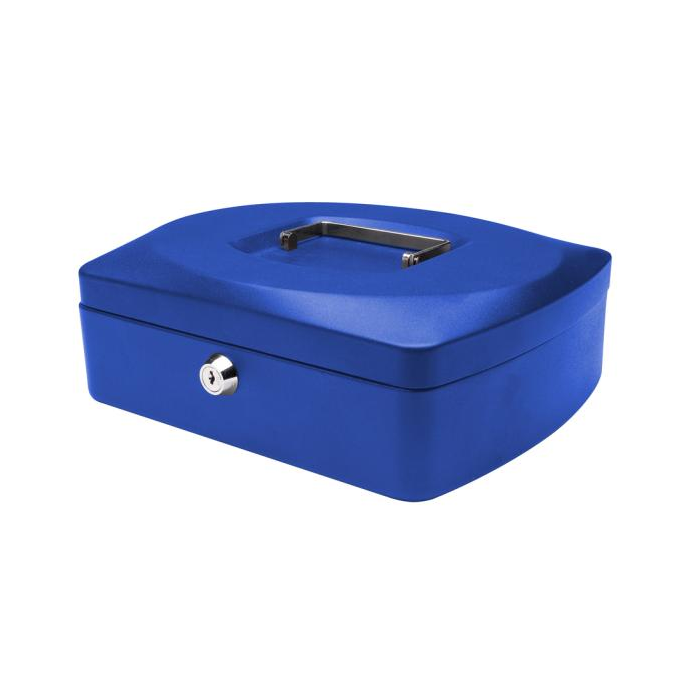 Uzamykateľná pokladnička s tvarovaným úchytom, plastovou priehradkou na mince a 2 kľúčami. Materiál pevná oceľ. Rozmery 255 × 85 × 200 mm. Farba modrá.