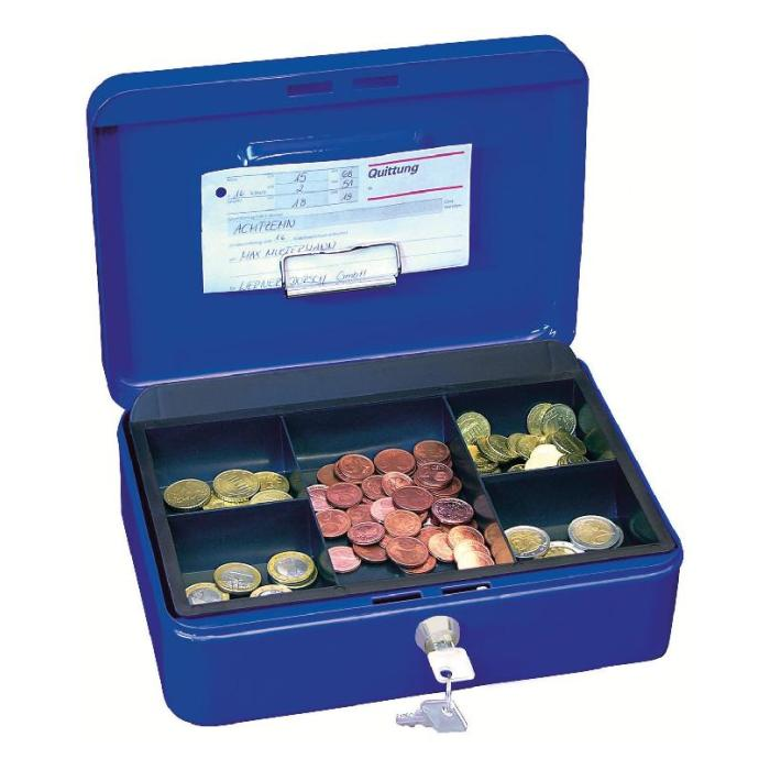 Uzamykateľná pokladnička s tvarovaným úchytom, plastovou priehradkou na mince a 2 kľúčami. Pod vekom zabudovaný klip na prichytenie bankoviek ako prevencia pred ich odfúknutím vetrom. Materiál pevná oceľ.