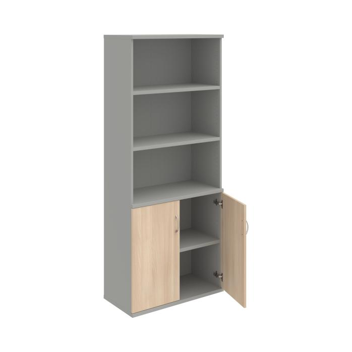 Kombinovaná skriňa - dvere/nika. Kancelárske skrine STRONG majú robustnú konštrukciu a vyššiu nosnosť políc ako bežné kancelárske skrine.V ponuke sú skriňové moduly s výškou 185 cm, 111 cm alebo 74 cm a šírky 80 cm alebo 40 cm.Hĺbka všetkých modelov skriňového radu STRONG je 40 cm.Chrbát, vyrobený z 8 mm hrubých dosák, je obojstranne pohľadový, takže skrine môžete použiť ako priestorový deliaci prvok. Hrúbka samotných políc je 25 mm, čo znamená nosnosť 80 kg na 1 policu.Korpusy, dvierka a police skríň sú olepené odolnou 2mm ABS hranou, ktorá garantuje dostatočnú ochranu proti poškodeniu.