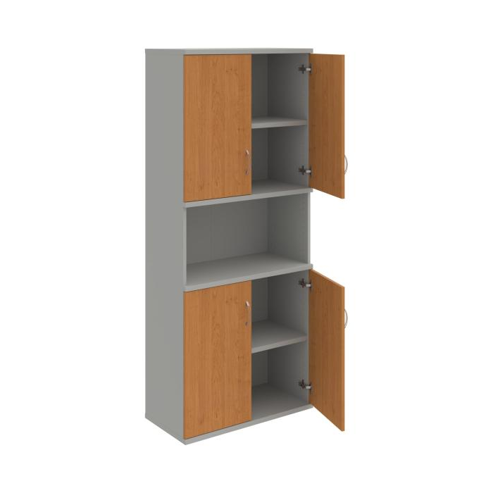 Kombinovaná skriňa - dvere/nika. Kancelárske skrine STRONG majú robustnú konštrukciu a vyššiu nosnosť políc ako bežné kancelárske skrine.V ponuke sú skriňové moduly s výškou 185 cm, 111 cm alebo 74 cm a šírky 80 cm alebo 40 cm.Hĺbka všetkých modelov skriňového radu STRONG je 40 cm.Chrbát, vyrobený z 8 mm hrubých dosák, je obojstranne pohľadový, takže skrine môžete použiť ako priestorový deliaci prvok. Hrúbka samotných políc je 25 mm, čo znamená nosnosť 80 kg na 1 policu.Korpusy, dvierka a police skríň sú olepené odolnou 2mm ABS hranou, ktorá garantuje dostatočnú ochranu proti poškodeniu.