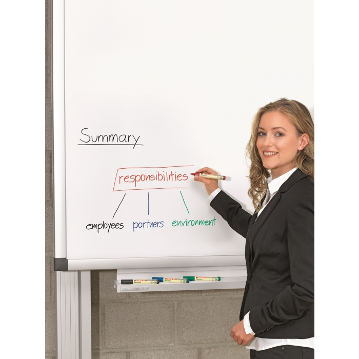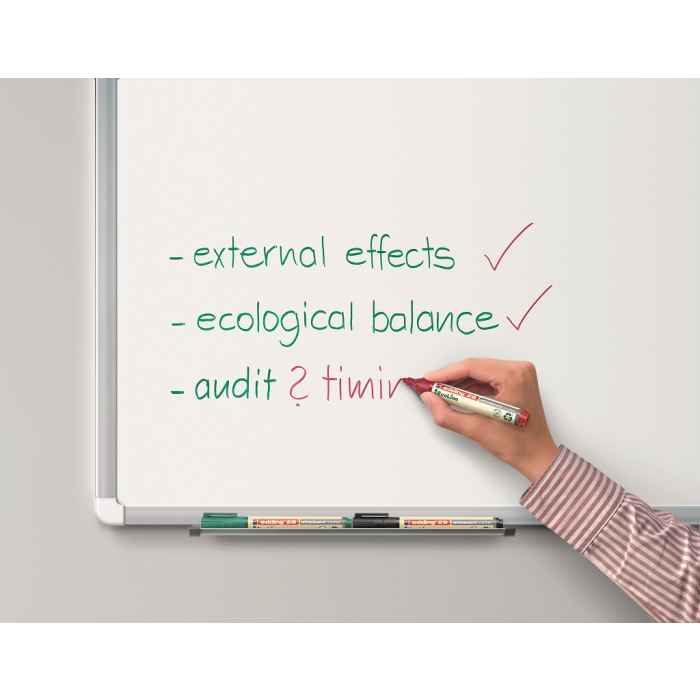 Popisovač na biele tabule, za sucha stierateľný prakticky zo všetkých neporóznych povrchov, ako je keramická úprava, melamín i sklo. Minimálne 80 % plastovej časti je vyrobených z recyklovaného materiálu. Okrúhly hrot, šírka stopy 1,5 - 3 mm. Rýchloschnúci, vodeodolný, slabo zapáchajúci atrament intenzívnej farby. Krátky čas vydrží neuzavretý bez vyschnutia. Väčšie balenie 10 ks.