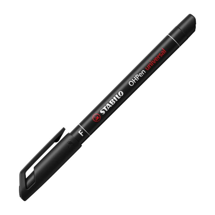 Permanentné popisovače na popisovanie takmer všetkých hladkých povrchov. Nekĺzavá úchytová zóna, praktický klip, bez vrchnáka vydrží až 3 dni. Väčšie balenie 10 ks v jednej farbe. STABILO® OHPen universal Fine (F) Hrot okrúhly, šírka stopy 0,7 mm. Farba čierna.
