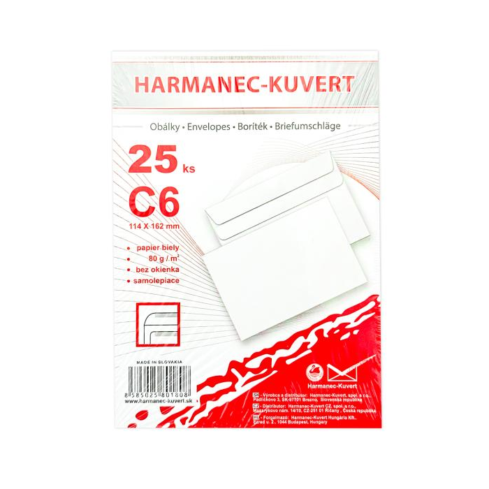 Biele obálky rozmeru 114 × 162 mm, vyrobené z bezdrevného papiera, 80 g/ m2. Samolepiace.