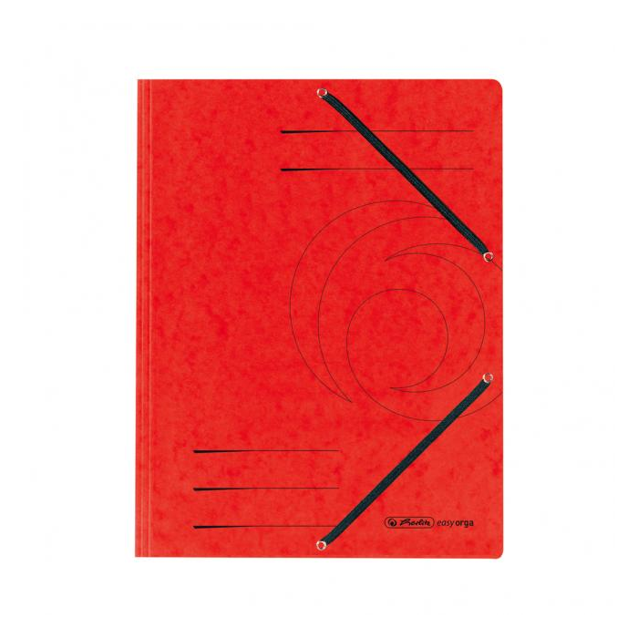Obal A4 s tromi chlopňami a dvomi gumičkami čiernej farby. Materiál prešpánový kartón gramáže 355 g / m². Väčšie balenie 25 ks. Farba červená.