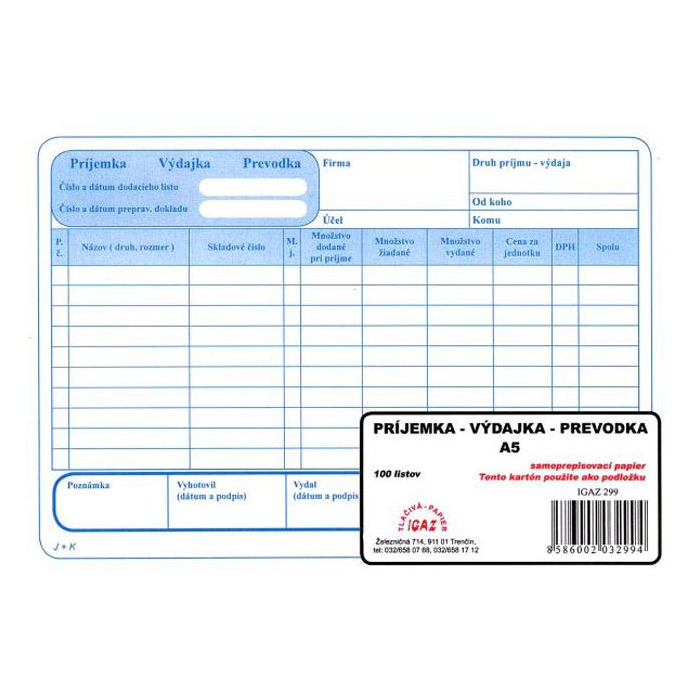 Obchodné tlačivo. Príjemka - výdajka - prevodka s DPH, samoprepis, A5, blok, 100 listov.