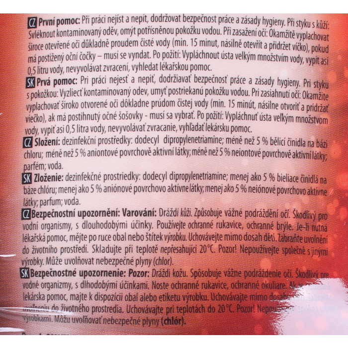 dráždi kožu. Spôsobuje vážne podráždenie očí. Škodlivý pre vodné organizmy, s dlhodobými účinkami.Používajte ochranné rukavice a okuliare.Ak je potrebná lekárska pomoc, majte po ruke obal alebo etiketu výrobku. Uchovávajte mimo dosahu detí.Zabránte uvoľneniu do životného prostredia. Uchovávajte pri teplotách do 20 C. Nepoužívajte spolu s inými výrobkami. Môžu uvoľňovať nebezpečné plyny (chlór).