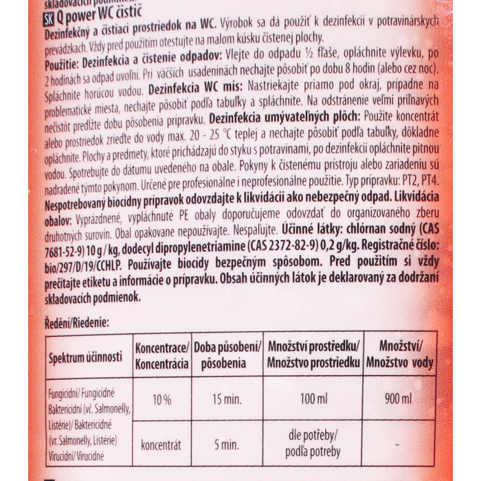Hustý gél na čistenie toaliet odstraňuje vodný kameň a nečistoty. Pohlcuje pach a intenzívne vonia. Q-Power čistič antibakteriálny dezinfekčný a čistiaci prostriedok na WC s 24-hodinovým účinkom. Výrobok sa dá použiť k dezinfekcii v potravinárskych prevádzkach.