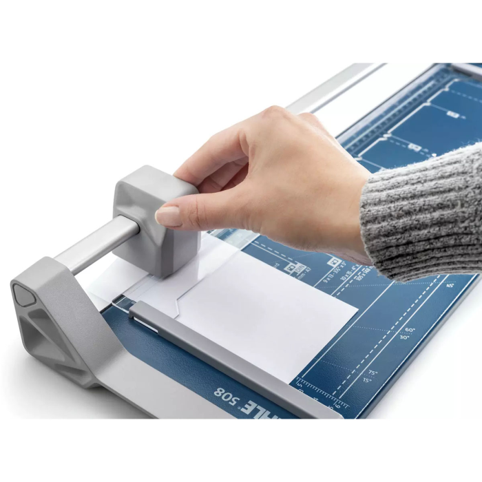 Rezačka s kruhovým nožom a kovovou základňou. Rotačný nôž v plastovom kryte, automatický prítlak, mierky v cm a DIN formátoch. Vhodná na rezanie papiera, etikiet, fotiek a filmov.