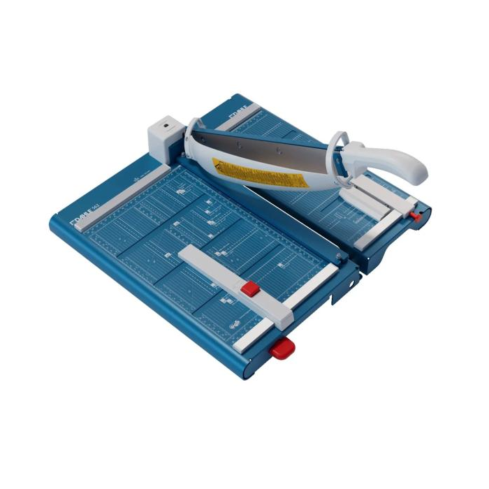 Protišmiková, robustná a presná páková rezačka s kovovou základňou a automatickým prítlakom. Brúsený vrchný a spodný nôž z kvalitnej nožiarskej ocele Solingen, rotujúci kryt okolo ostria. Presná mierka v cm/ inch a DIN formátoch. Výrez na spodnej časti na pohodlné prenášanie. Veľkosť stola 460 × 490 mm. Komfortná výbava s podporným predným stolom a zariadením na rezanie tenkých prúžkov a laserovým lúčom, indikujúcim reznú líniu.