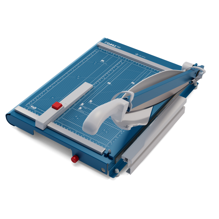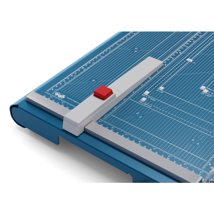 Veľkorozmerná, protišmyková a presná páková rezačka z pevného oceľového plechu. Základný vrchný a základný spodný brúsený nôž vyrobený z kvalitnej nožiarskej ocele Solingen. Rotujúci kryt okolo ostria chráni prsty pred náhodným porezaním. Presná mierka v cm/inch a DIN formátoch. Automatický prítlak. Model s výrezmi na pohodlné prenášanie, navyše vybavený predným dorazom, vysúvateľným do 170/185 mm. Pohodlná práca vďaka ergonomickej rukoväti optimalizovanej pre prenos sily zhora. Unikátny automatický ochranný kryt Dahle pre jasný výhľad na reznú hranu.