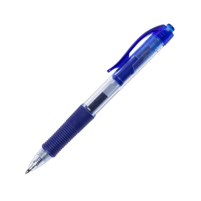 Klikací roller s robustnejším transparentným telom a gumeným úchytom. Farba tela vo farbe náplne. Guľôčka 0,7 mm, širka stopy 0,5 mm. Väčšie balenie 12 ks. Farba: modrá