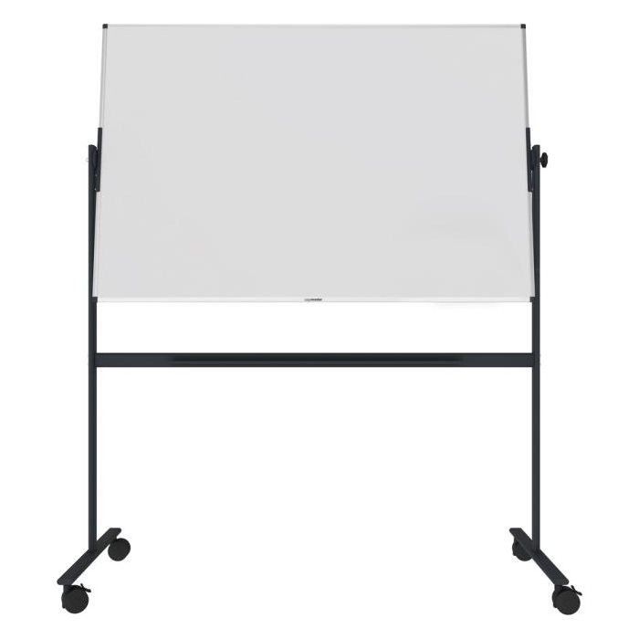 Základná rotačná tabuľa na príležitostné použitie v kancelárii, triede alebo v priemyselnom prostredí. Vhodná na písanie popisovačmi na tabuľu stierateľnými za sucha. Obojstranný, magnetický, lakovaný oceľový povrch dosky. Hliníkový rám so sivými plastovými rohovými krytkami. Upevnený na robustnom a mobilnom stojane s otočnou osou. Súčasťou balenia je odkladacia lišta. Rozmery v × š : 100 × 150 cm.