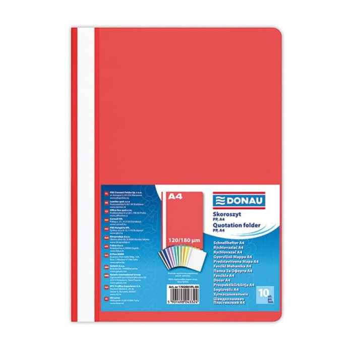 Štandardný polypropylénový rýchloviazač s priehľadnou prednou stranou a nasúvacím popisným pásikom. Formát A4. Balenie 10 ks.