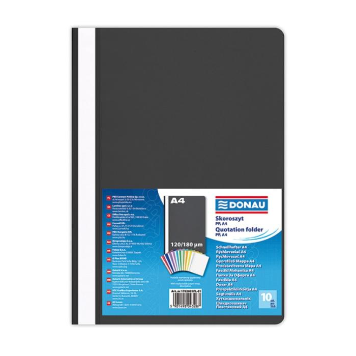 Štandardný polypropylénový rýchloviazač s priehľadnou prednou stranou a nasúvacím popisným pásikom. Formát A4. Balenie 10 ks.