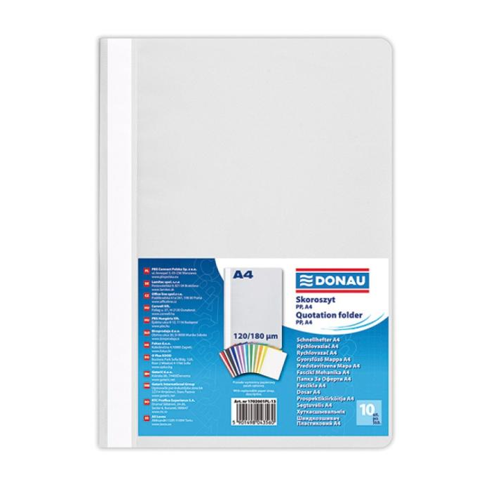 Štandardný polypropylénový rýchloviazač s priehľadnou prednou stranou a nasúvacím popisným pásikom. Formát A4. Balenie 10 ks.
