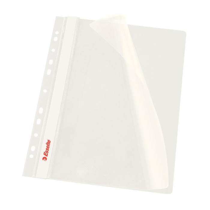 Obal s eurodierovaním z kvalitného PVC na uloženie dierovaných dokumentov do formátu A4. Predná strana priehľadná, pozdĺž chrbta biely obojstranný papierový zasúvací štítok. Rozmery 310 × 235 mm. Farba biela.