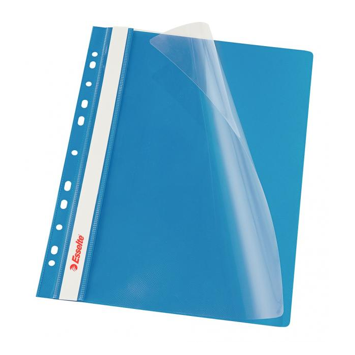 Obal s eurodierovaním z kvalitného PVC na uloženie dierovaných dokumentov do formátu A4. Predná strana priehľadná, pozdĺž chrbta biely obojstranný papierový zasúvací štítok. Rozmery 310 × 235 mm. Farba modrá.